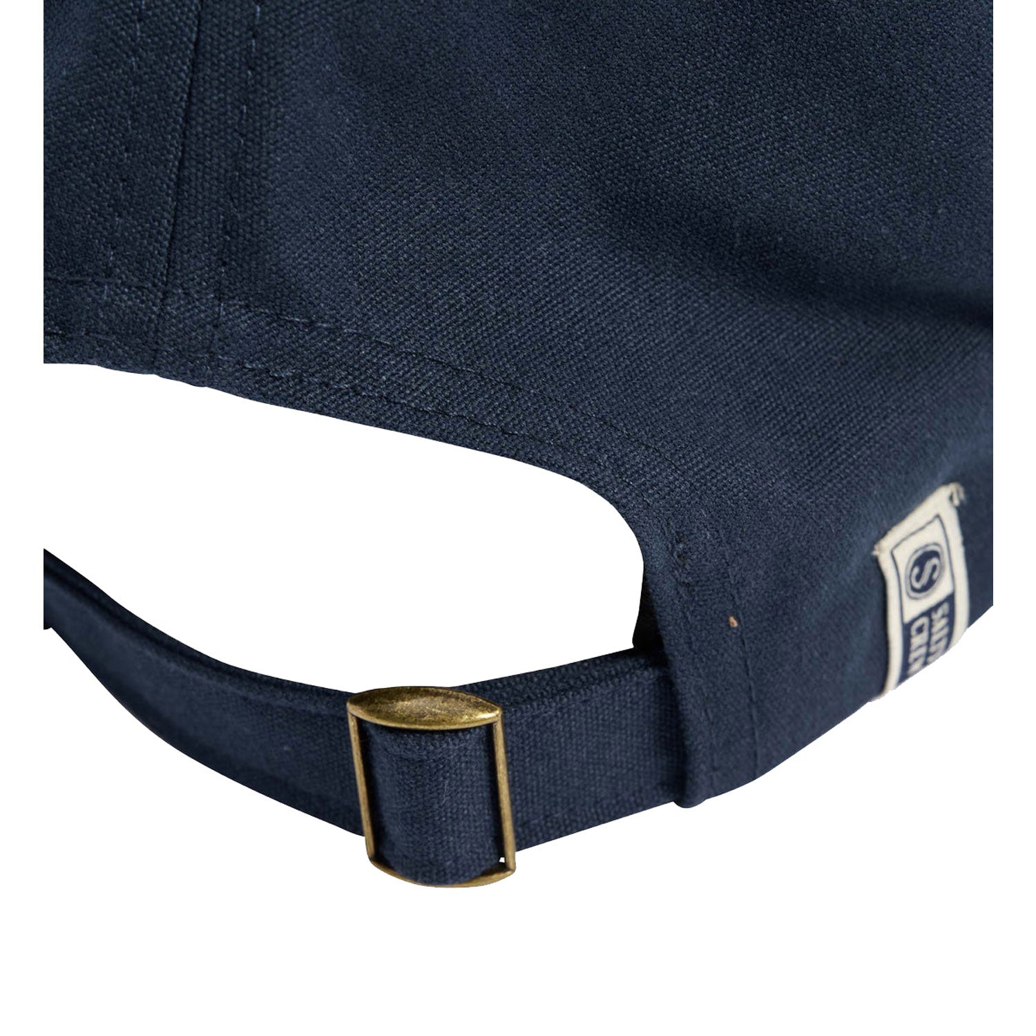 The Fast Track Strapback Cap in Navy is a 5-panel cap made from 100% cotton canvas and polyester microfiber. It features an embroidered logo at the front and an adjustable strapback closure.
