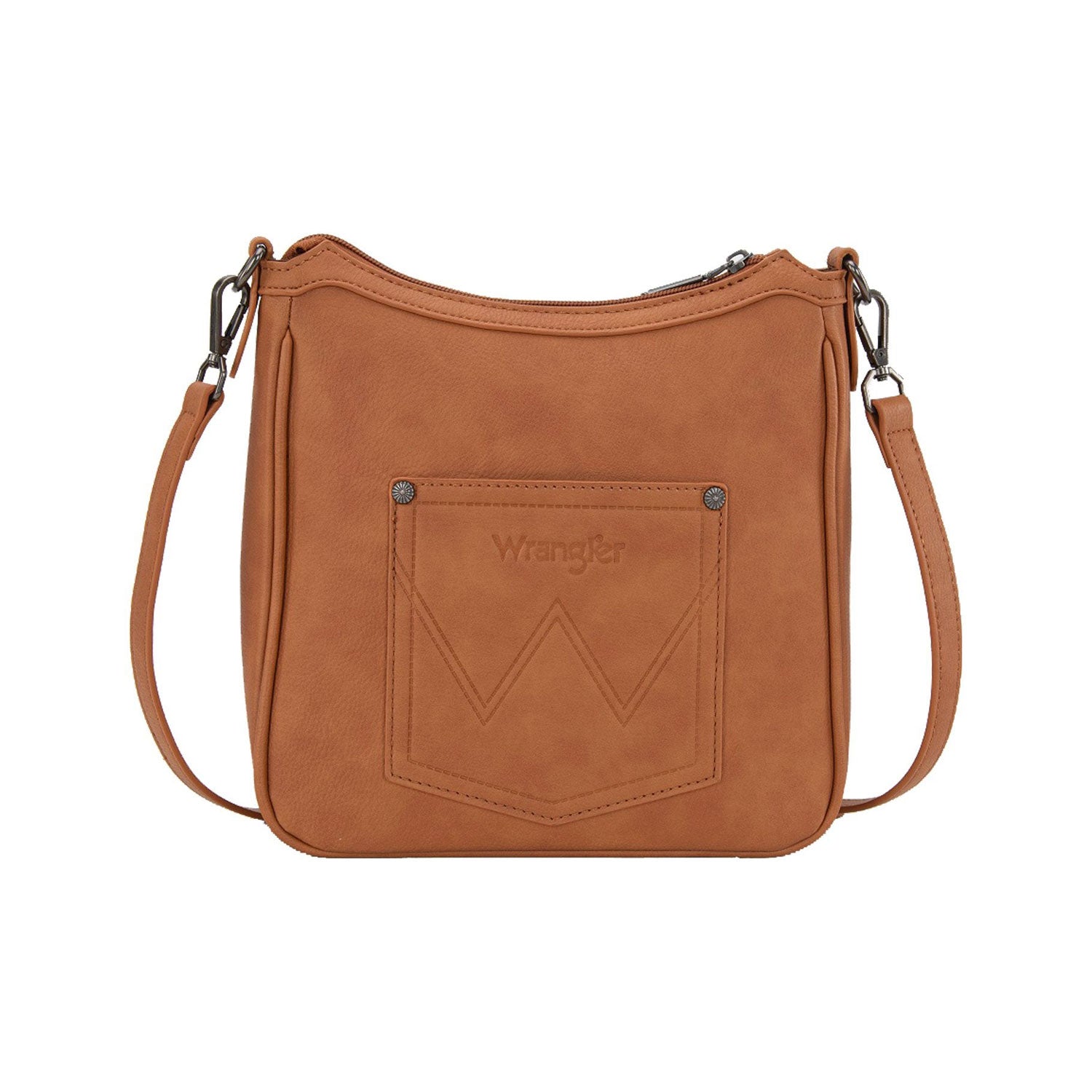 Carry your essentials with a touch of southwestern flair. This Wrangler crossbody features a striking woven Aztec pattern on the front and comes with a detachable, adjustable strap that lets you wear it your way—slung across your body or swapped out entirely. Perfect for hands-free adventures in a warm tan shade.