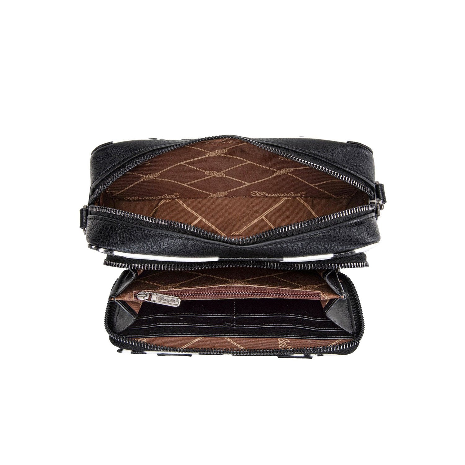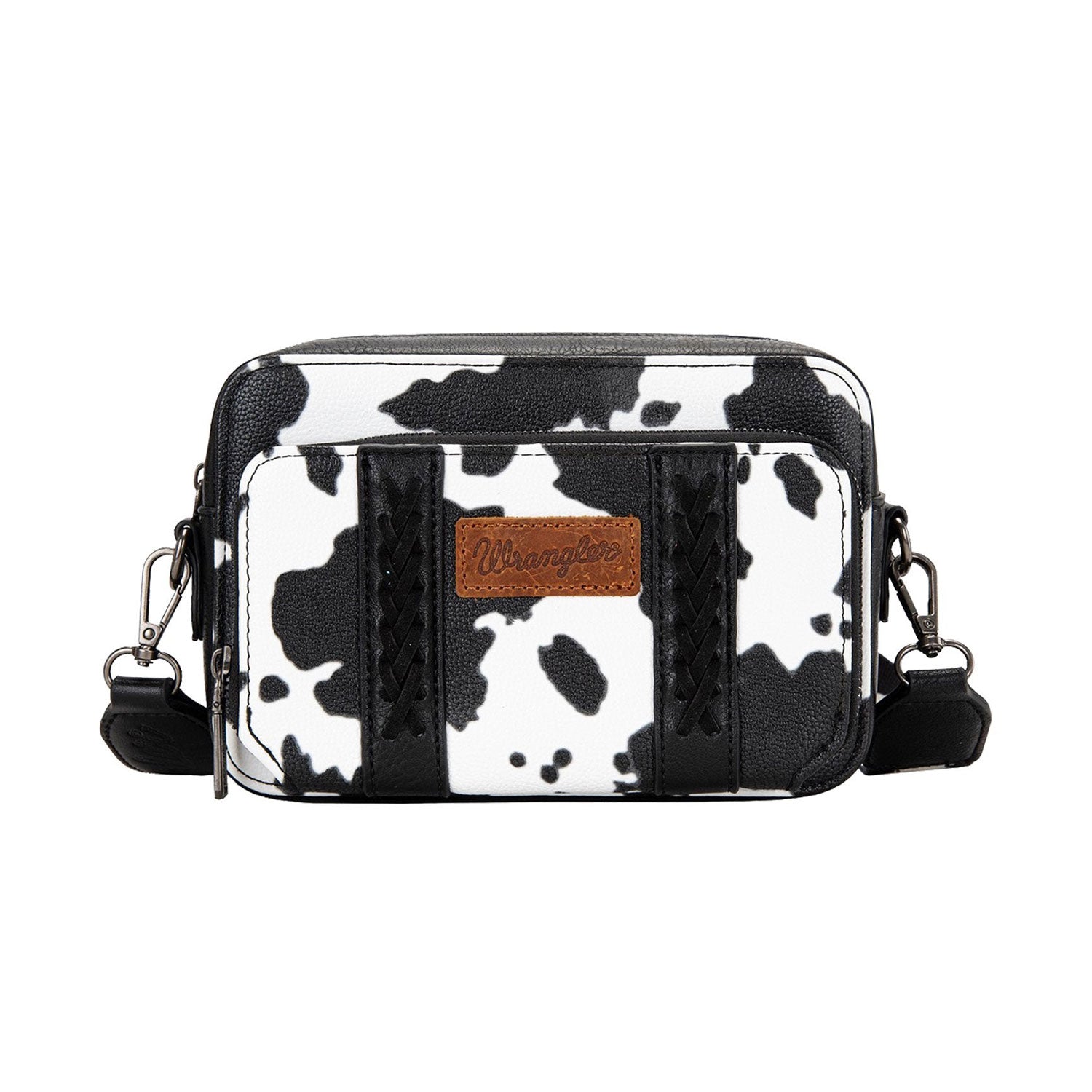 Saddle up style with this cheeky Wrangler crossbody that brings Western flair to your everyday carry. Featuring a bold cow print design and signature whipstitch accents, it's the perfect compact companion for those who don't take fashion too seriously. Sling it across your body and let your personality do the talking.
